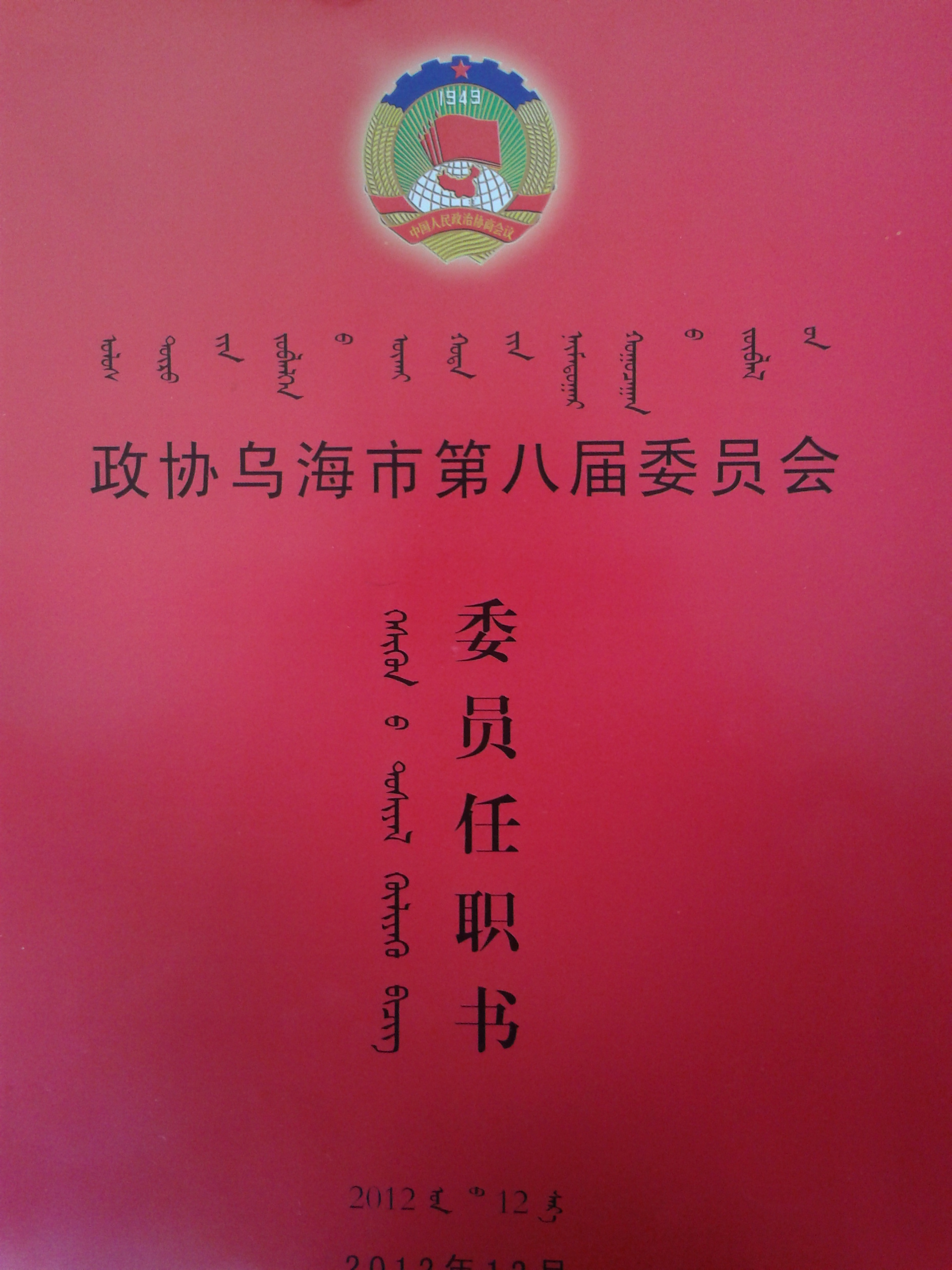 乌海市政协第八届委员任职书